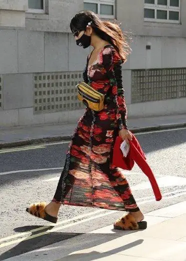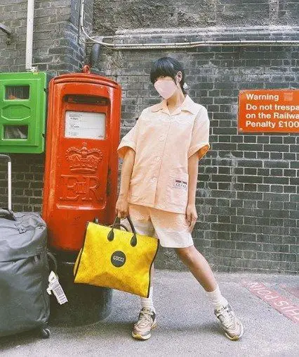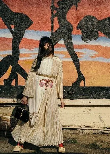 ragazza con mascherina, abito orientale e marsupio Gucci
