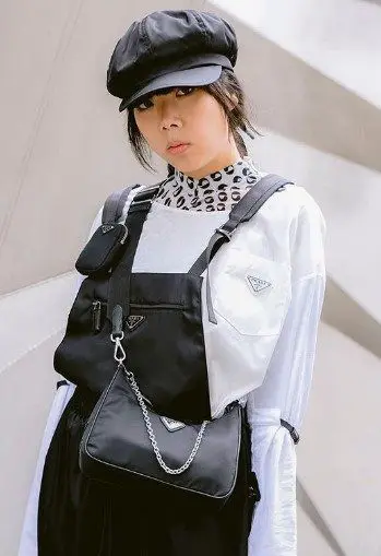 ragazza con outfit total Prada bianco e nero