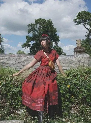 ragazza sulle aiuole con abito stampato e marsupio
