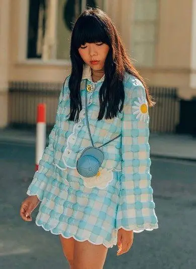 ragazza con abito a quadri in stile campagnolo e tracolla a forma di cappello snapback