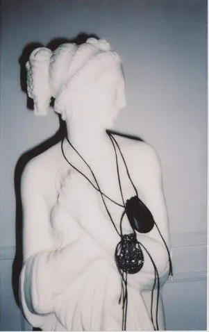 statua femminile con borsette a collo nere